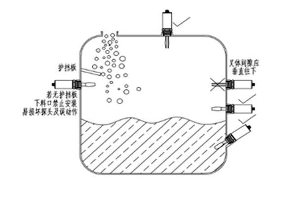 1、正確安裝方式:A.頂部安裝,探頭垂直向下,可安裝在頂部(遠(yuǎn)離進(jìn)料口)的任何位置;